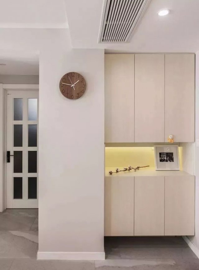 玄关设计了一组极简的鞋柜,鞋柜中部留空可以随手放置小物,悬空的设计可以放些换穿的鞋子。