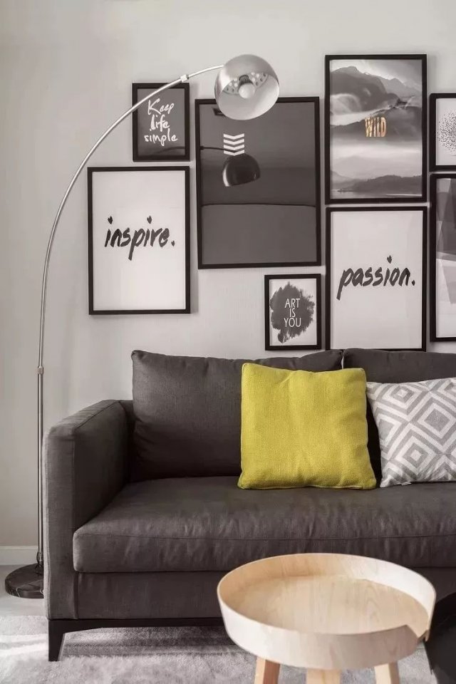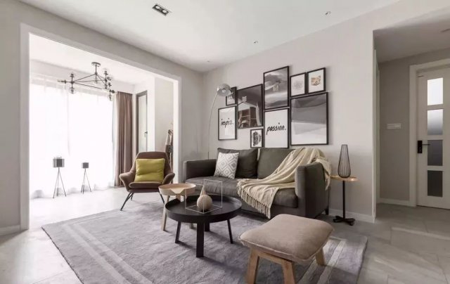 墙面采用水泥灰,搭配灰色的布艺沙发、灰色地毯,背景墙以一组装饰画点缀,打造简单明净的北欧风情。